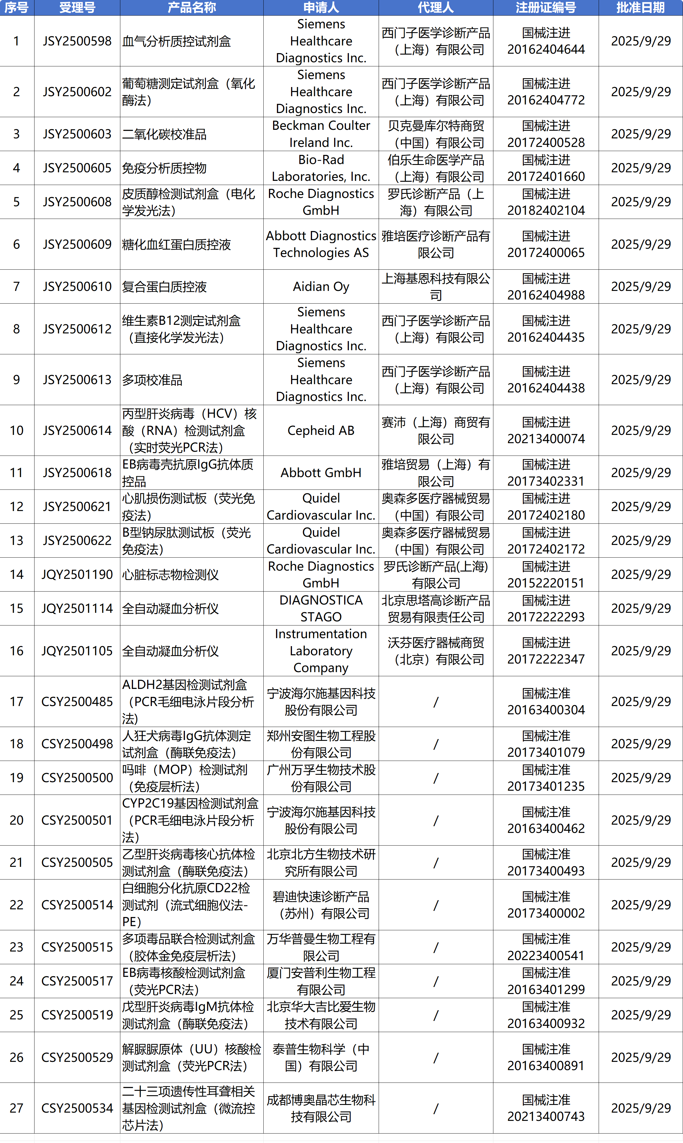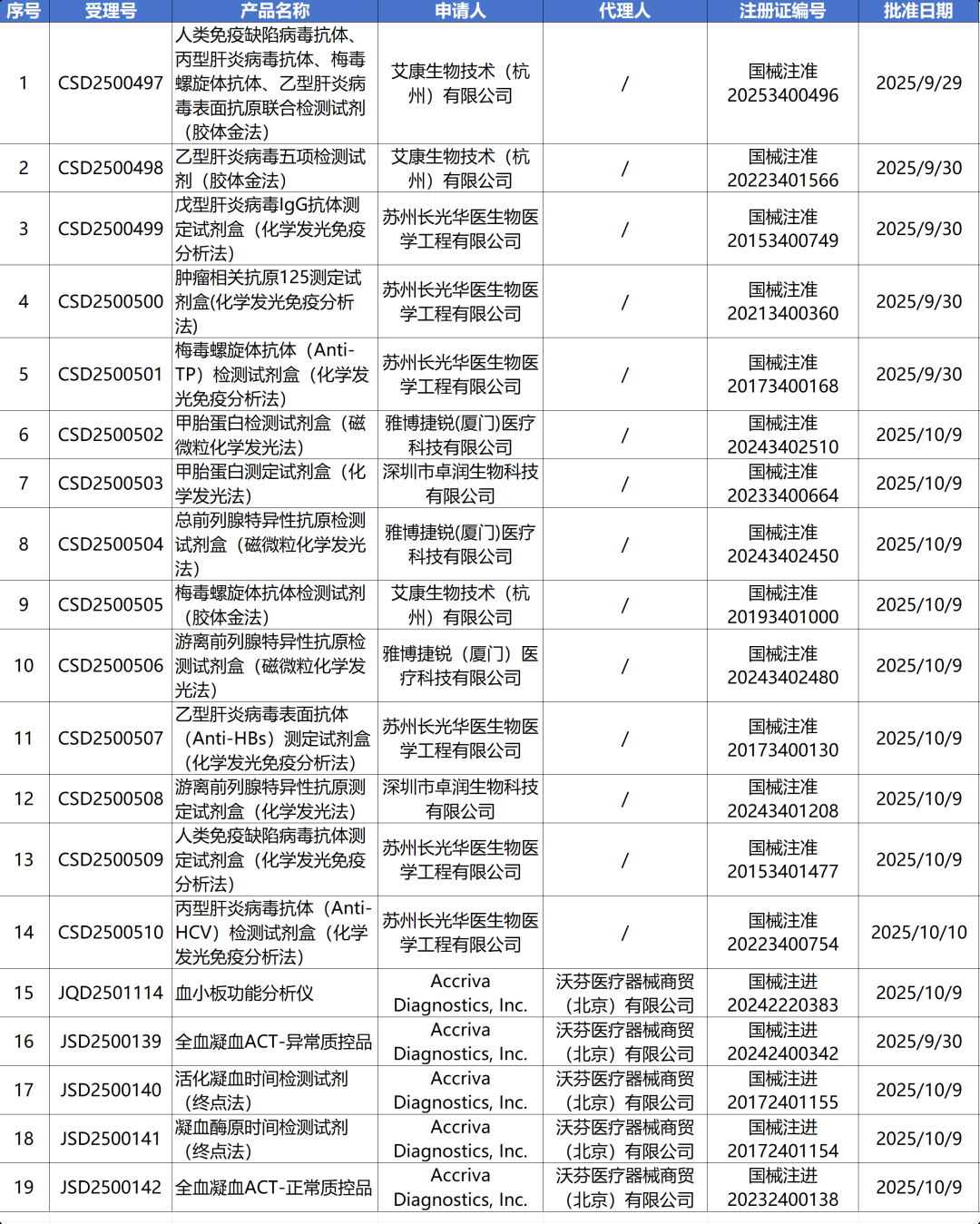 10月11日,国家药监局审批通过了185个医疗器械,其中有19个IVD产品变更注册,27个产品延续注册。
