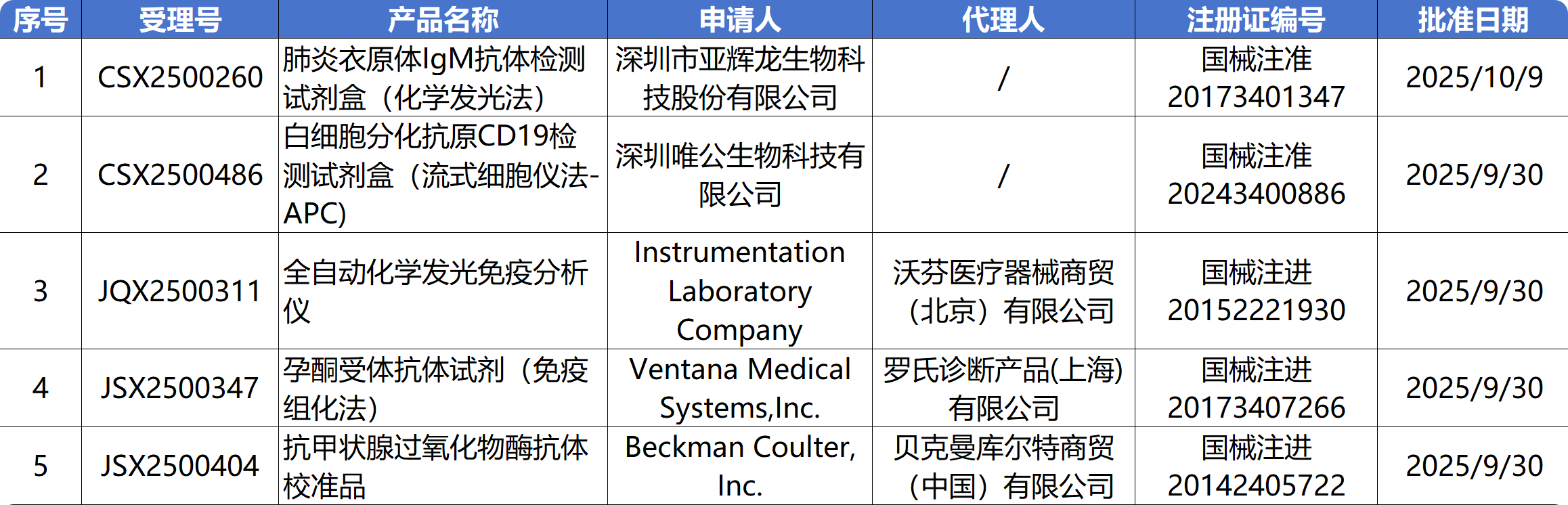 10月13日,国家药监局审批通过了53个医疗器械,其中有5个IVD产品变更注册。
