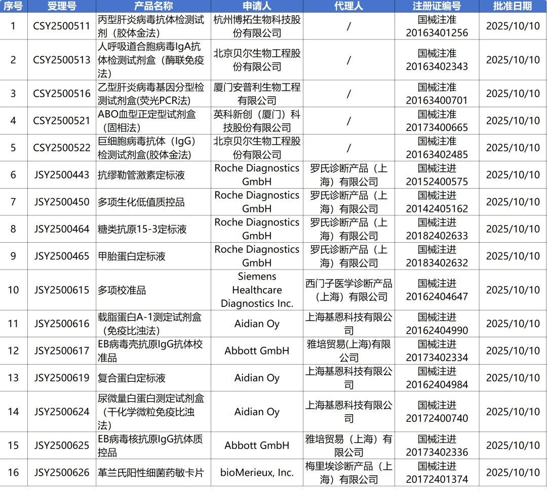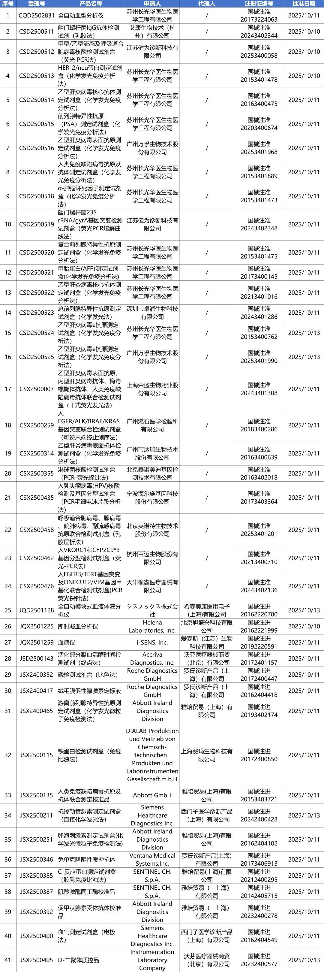 10月14日,国家药监局审批通过了122个医疗器械,其中有41个IVD产品变更注册,16个IVD产品延续注册。