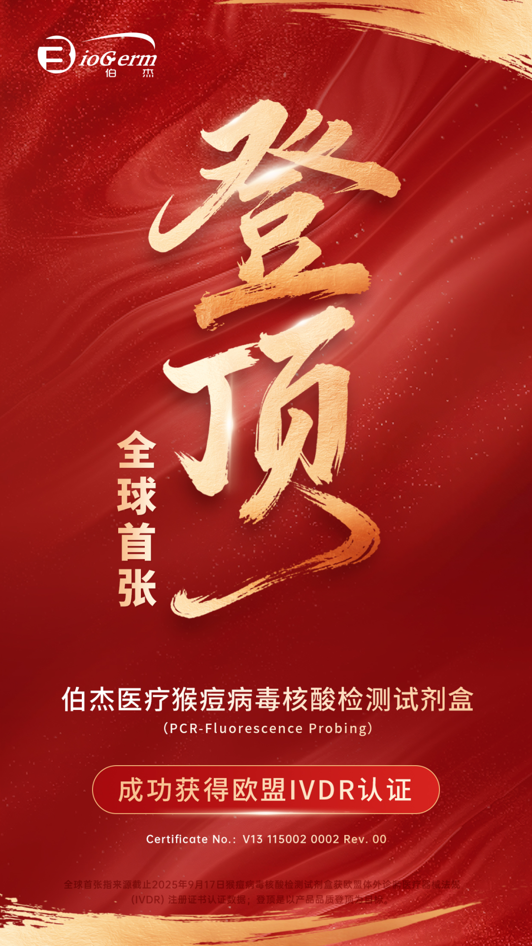 伯杰医疗猴痘病毒核酸检测试剂盒(PCR-荧光探针法)于2025年9月17日成功获得欧盟体外诊断医疗器械法规(IVDR)注册证书,成为全球首个、且目前唯一获得IVDR认证的猴痘病毒核酸检测试剂盒!