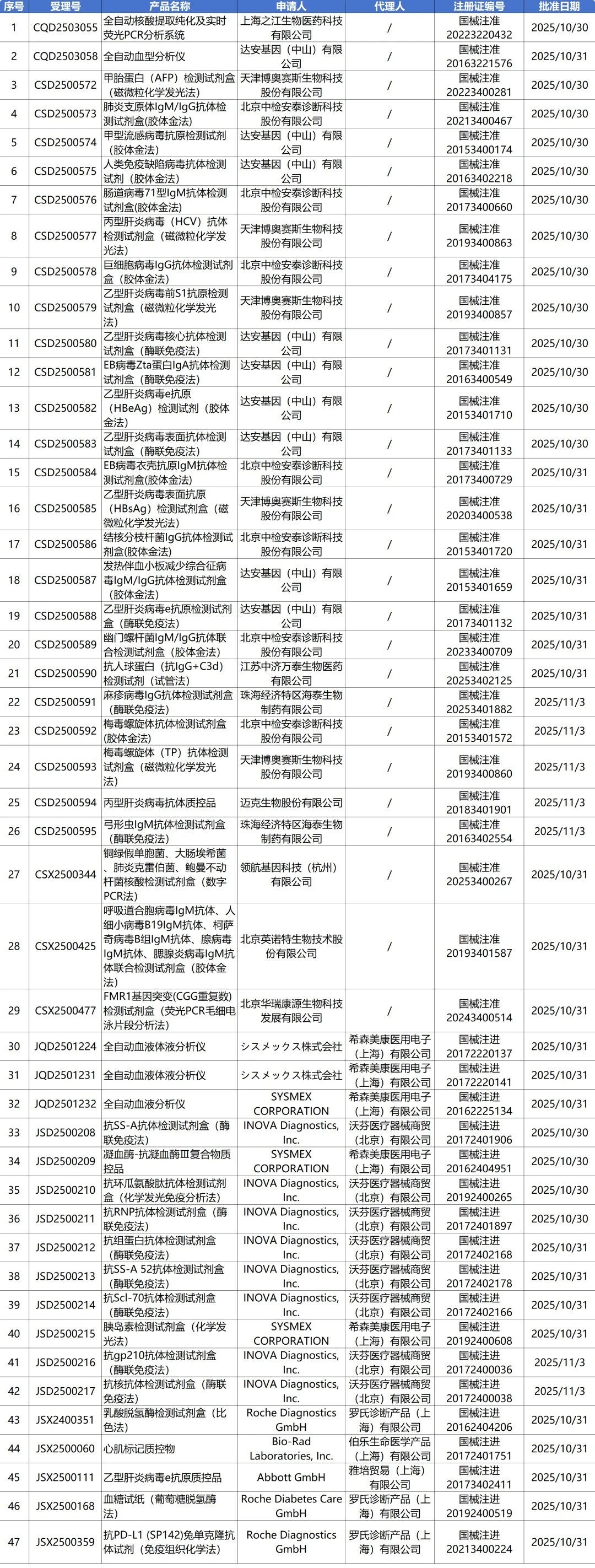 11月4日,国家药监局审批通过了121个医疗器械,其中有47个IVD产品变更注册。
