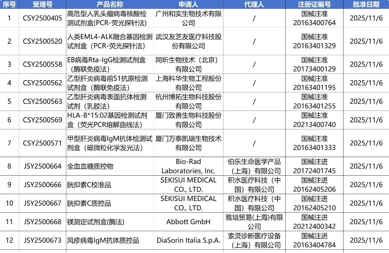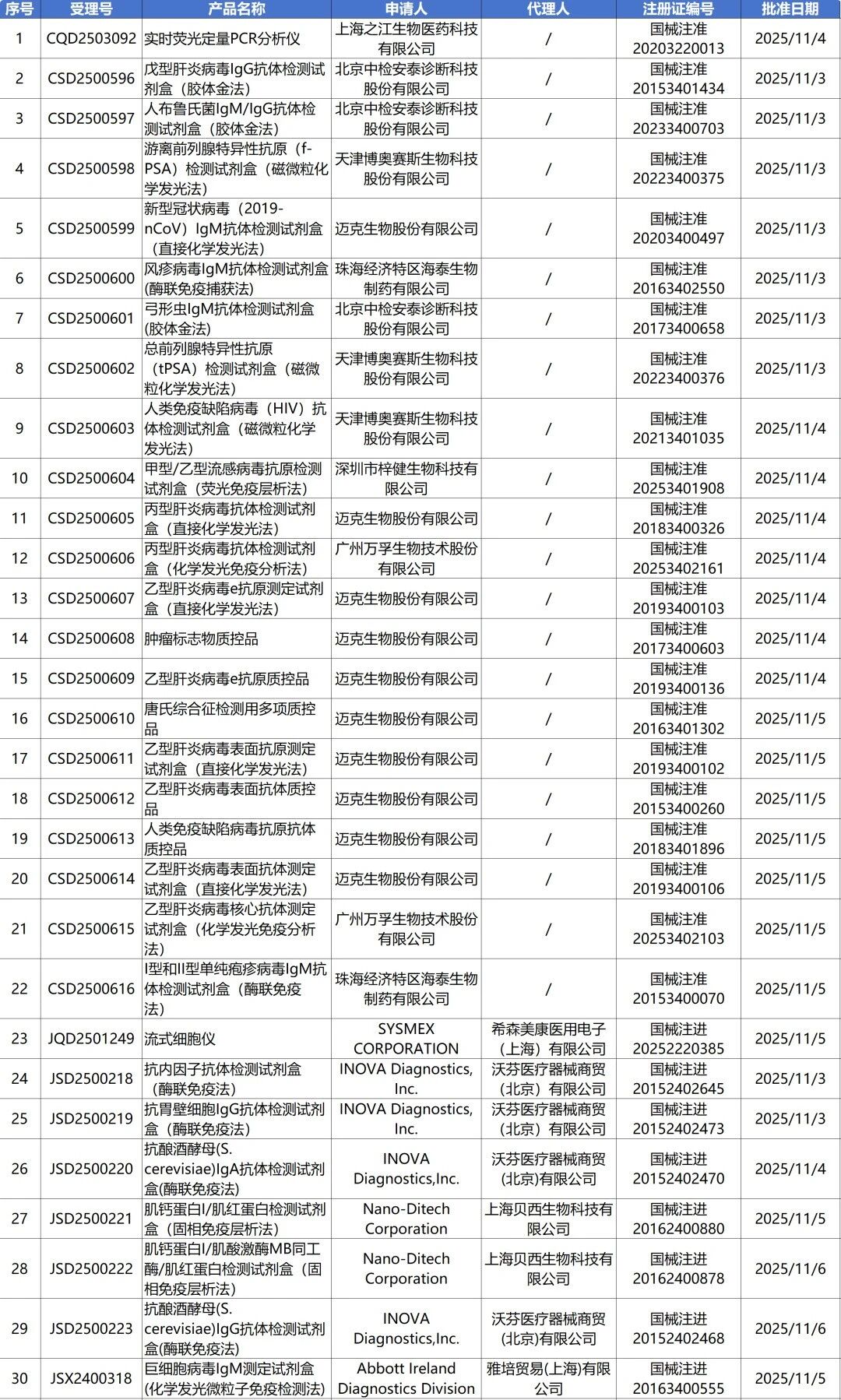 11月10日,国家药监局审批通过了145个医疗器械,其中有30个IVD产品变更注册,12个IVD产品延续注册。