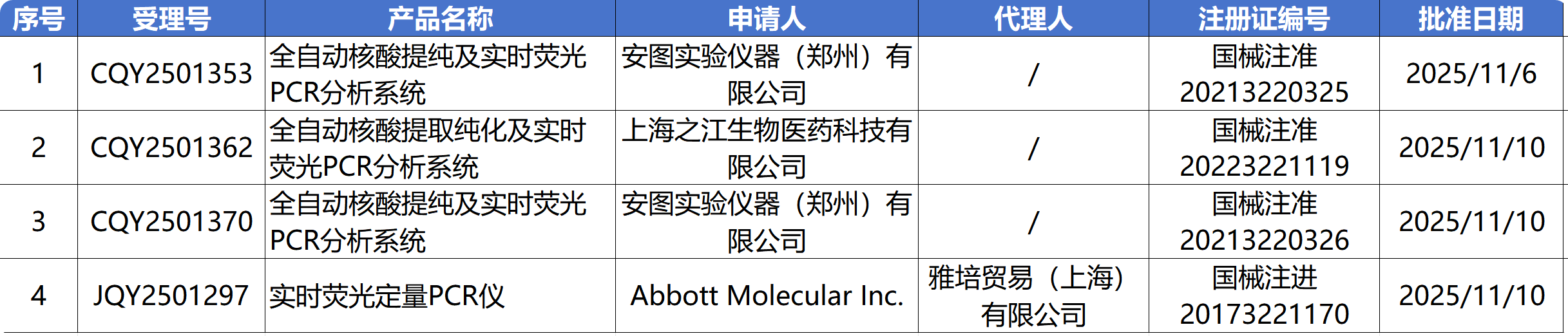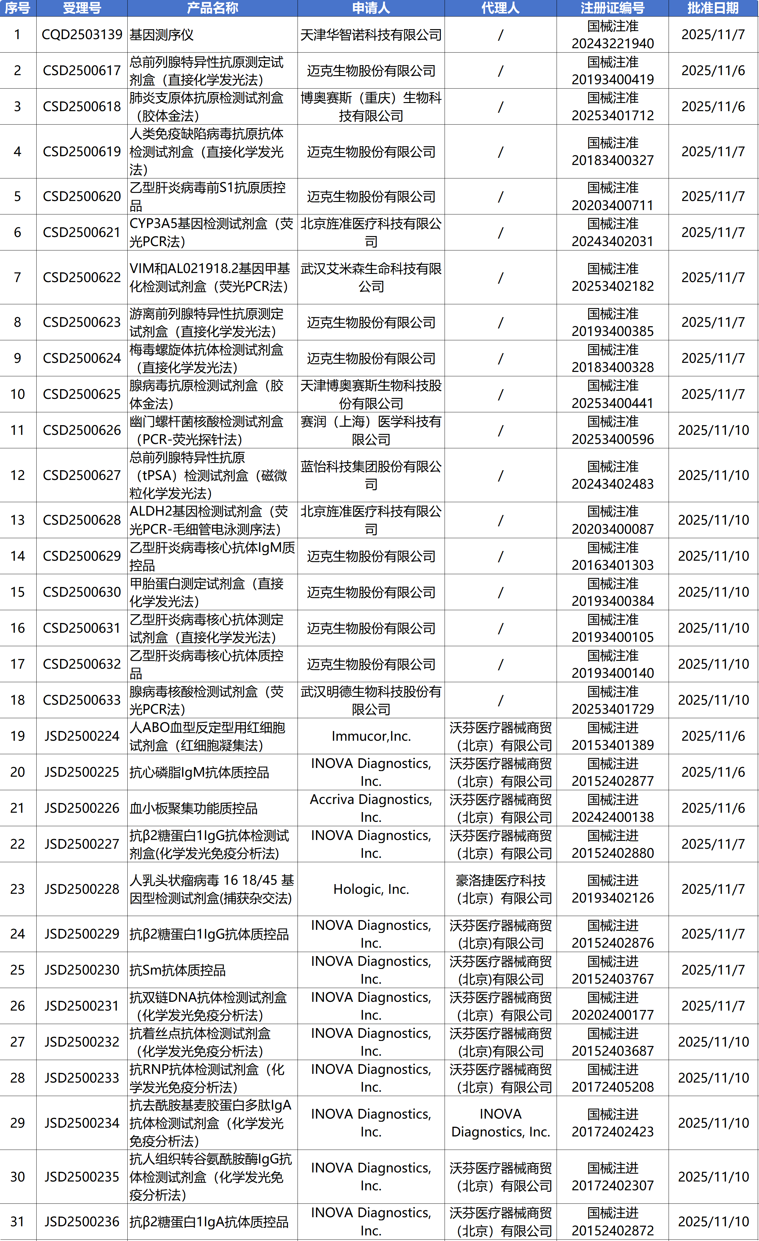 11月11日,国家药监局审批通过了145个医疗器械,其中有31个IVD产品变更注册,4个IVD产品延续注册。
