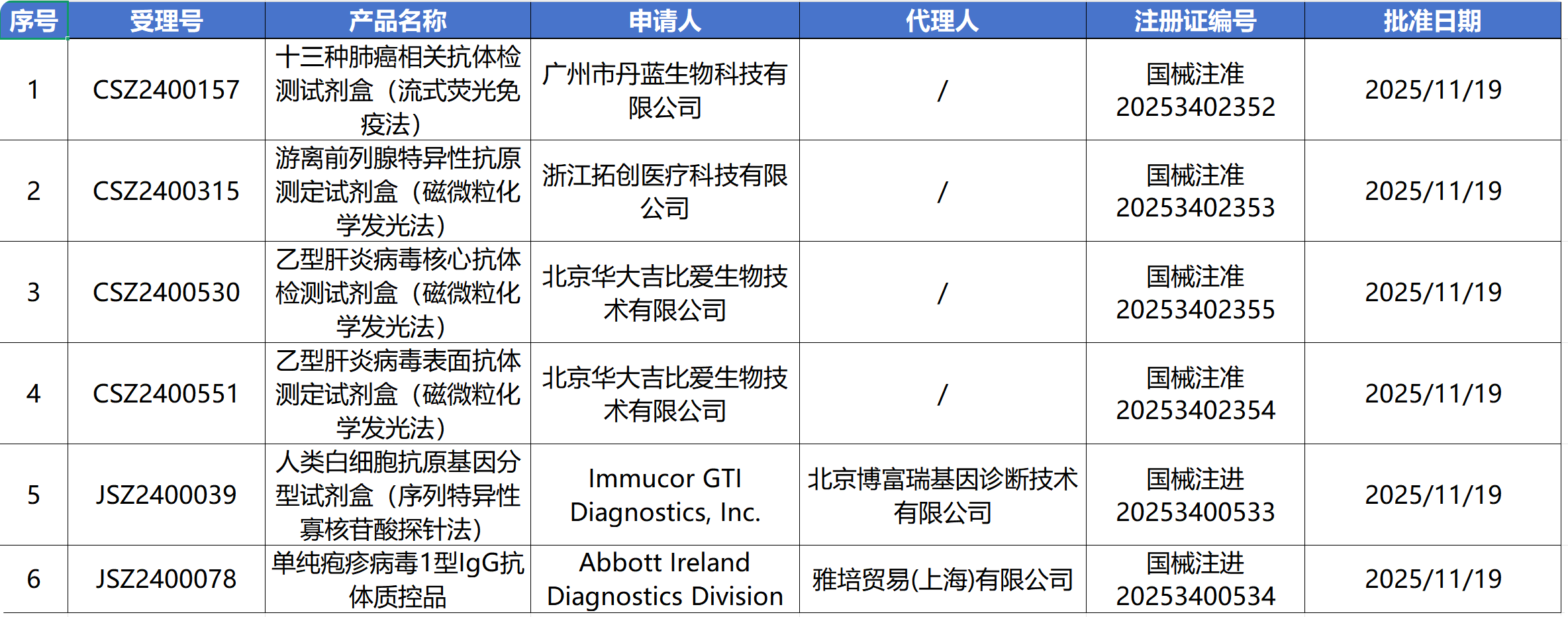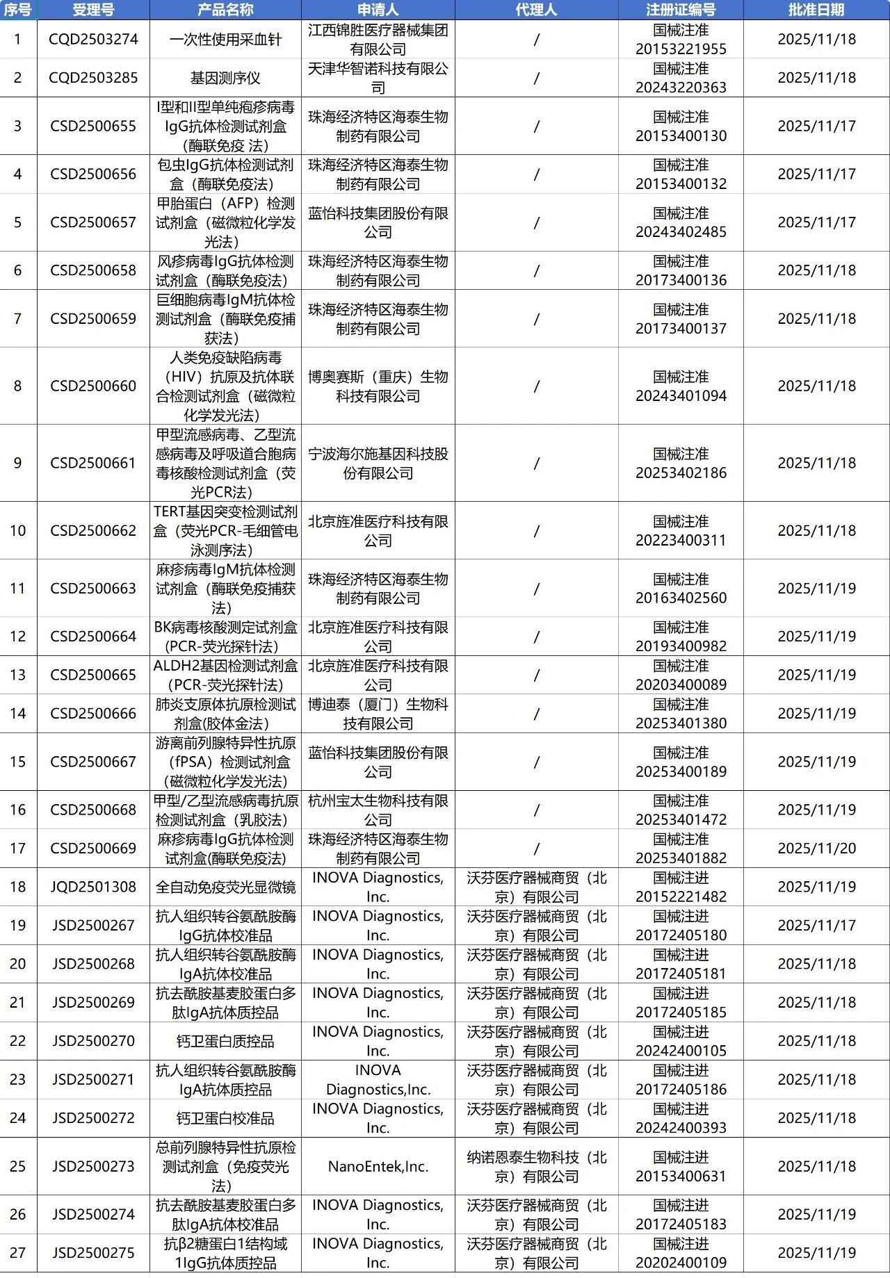 11月21日,国家药监局审批通过了134个医疗器械,其中有27个IVD产品变更注册,6个IVD新品获批上市。