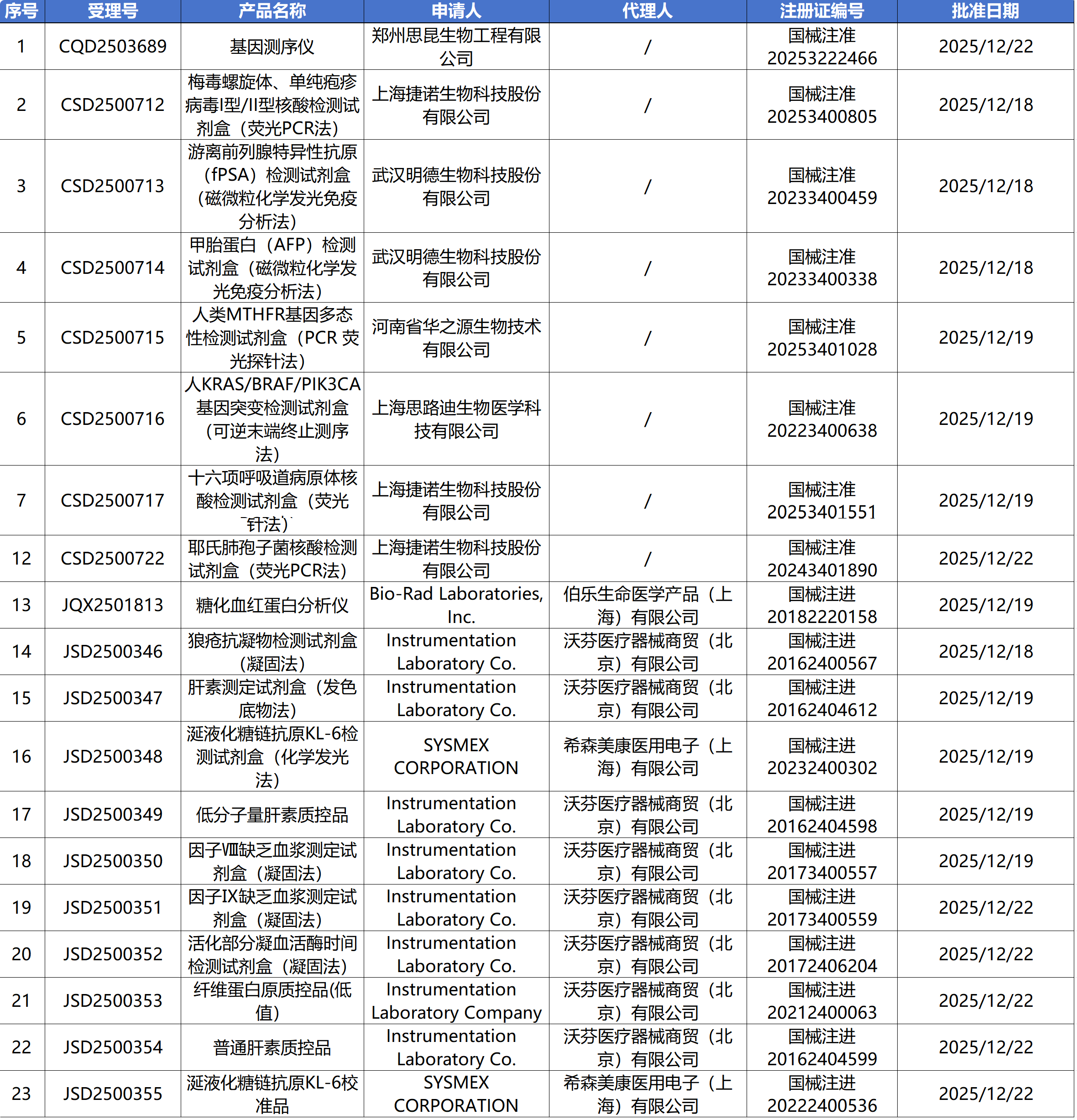 12月23日,国家药监局审批通过了109个医疗器械,其中有23个IVD产品变更注册,1个IVD产品延续注册。