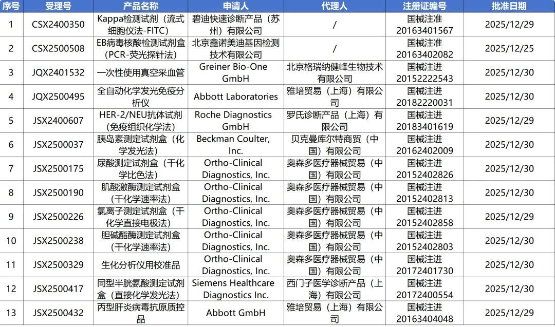 1月4日,国家药监局审批通过了152个医疗器械,其中有13个IVD产品变更注册,6个IVD产品延续注册。
