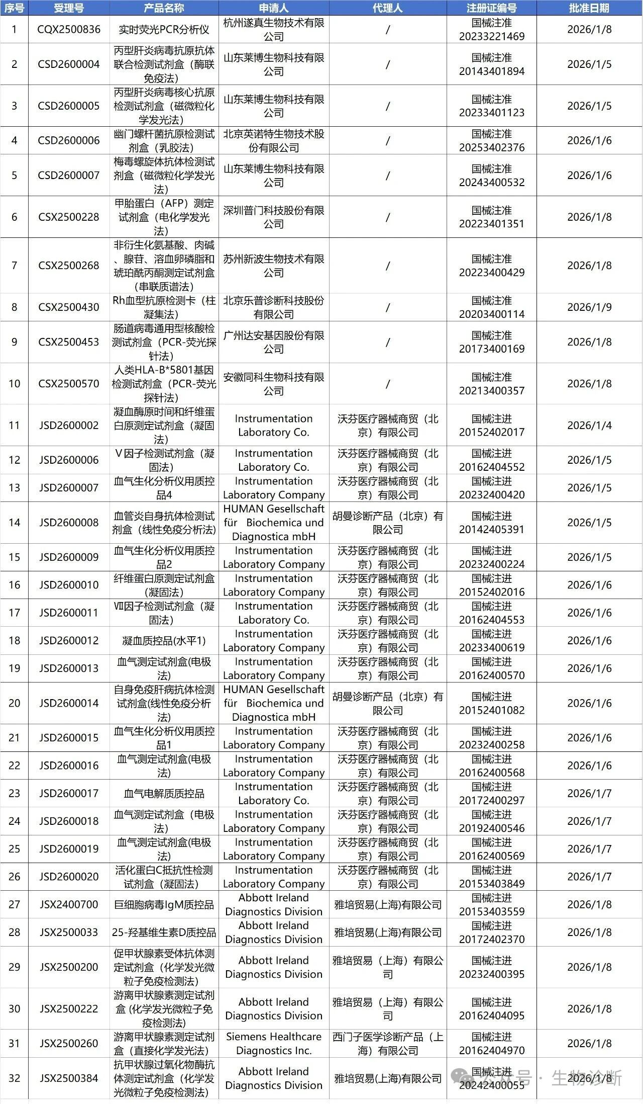 1月12日,国家药监局审批通过了129个医疗器械,其中有32款IVD产品变更注册,1款IVD产品延续注册。