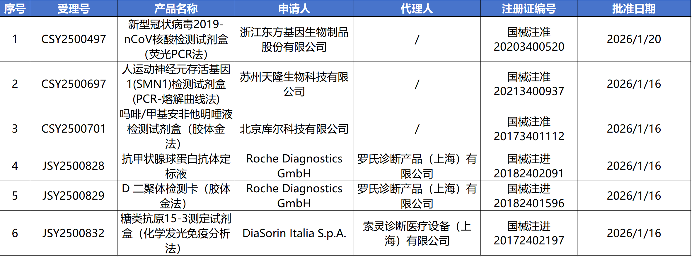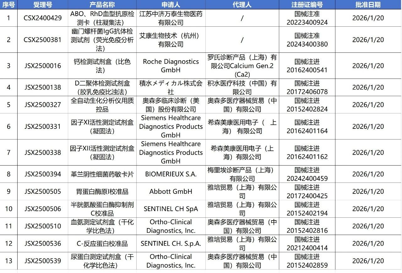 1月21日,国家药监局审批通过了65个医疗器械,其中有2款IVD产品获批上市,13款IVD产品变更注册,6款IVD产品获批续证。