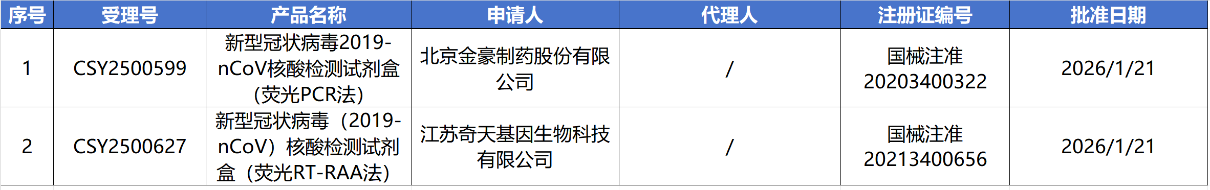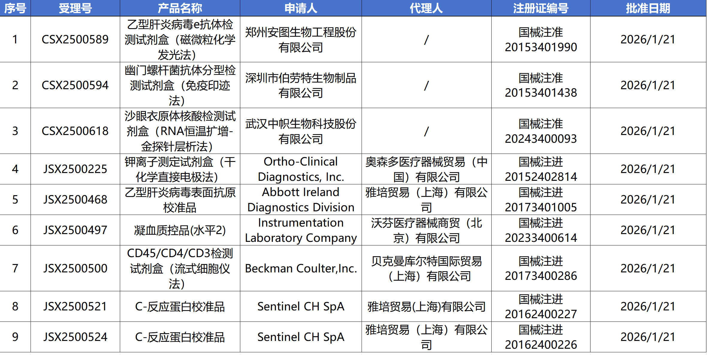 1月23日,国家药监局审批通过了24个医疗器械,其中有9款IVD产品变更注册,2款IVD产品获批续证。