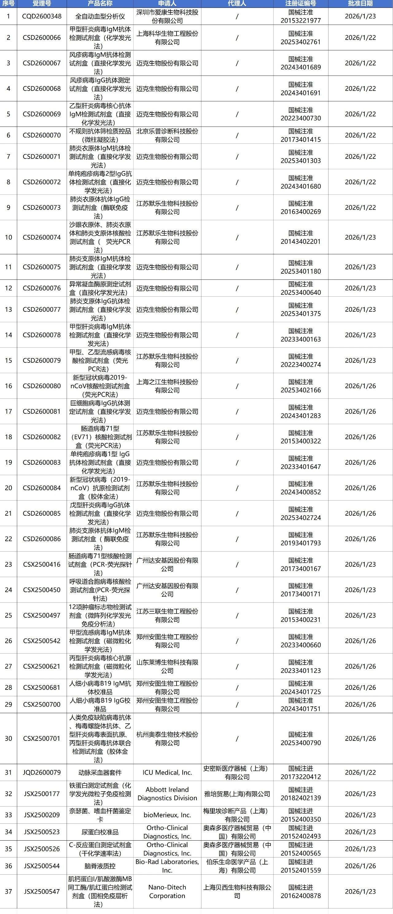 1月27日,国家药监局审批通过了106个医疗器械,其中有37个IVD产品变更注册。