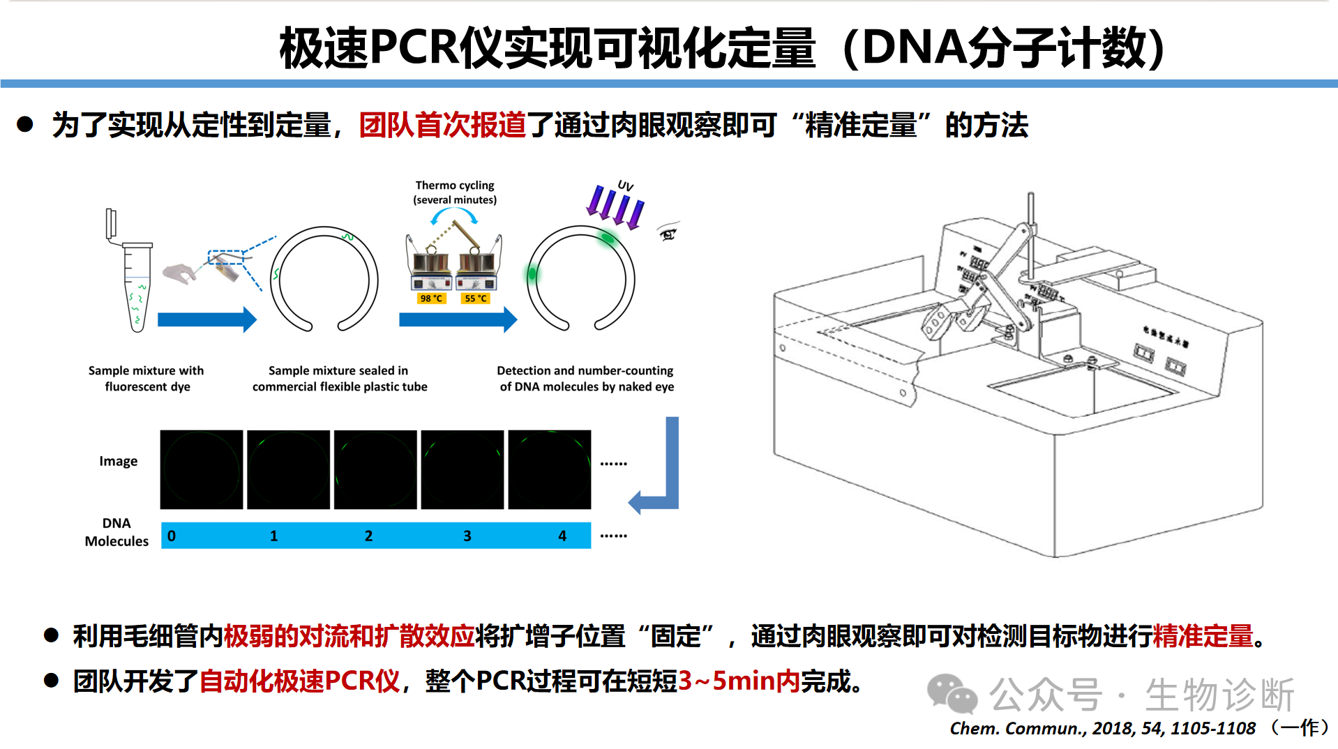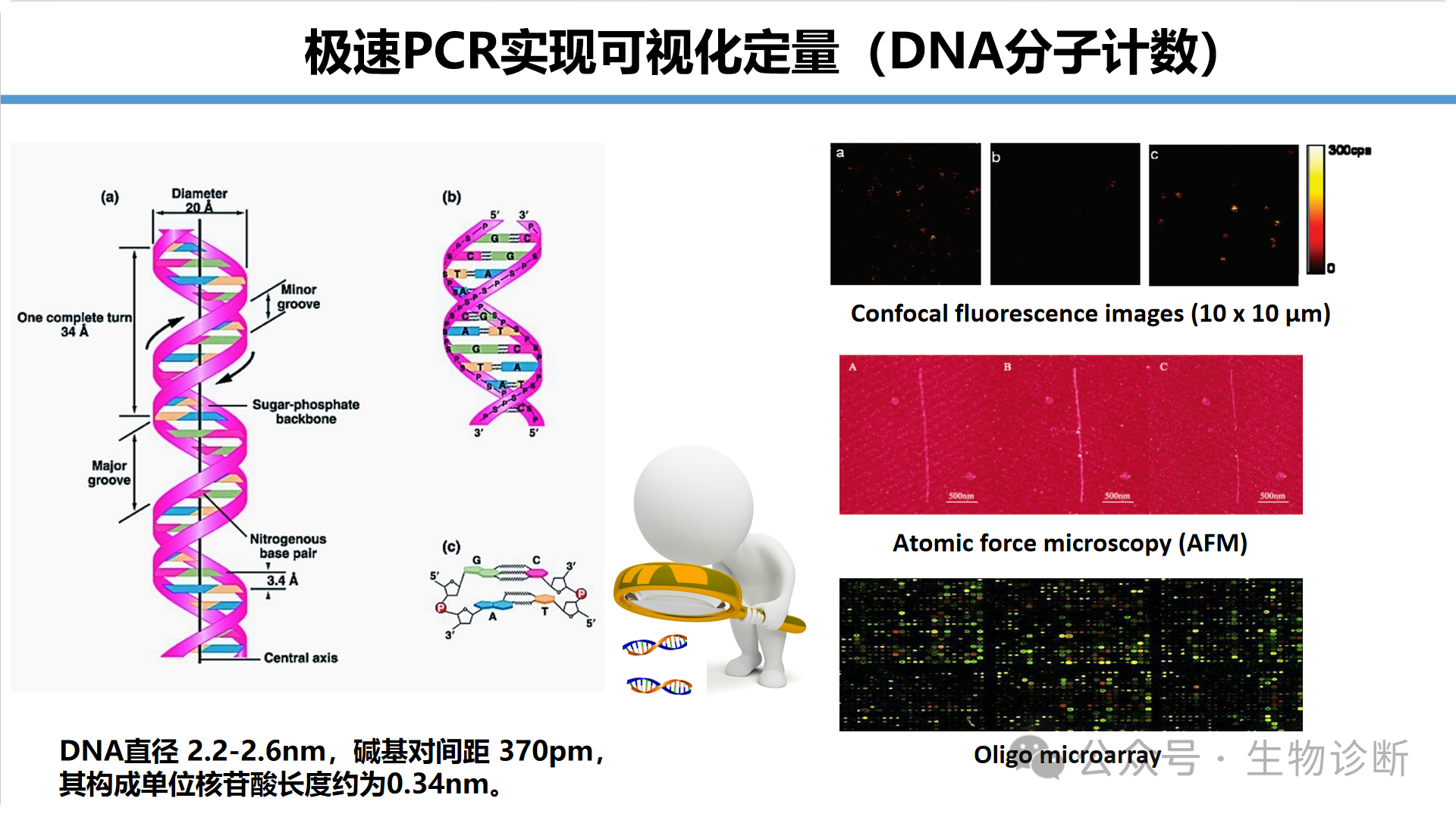 技术原理:DNA直径2.2-2.6 nm,在毛细管内扩增后形成固定荧光斑点,每个斑点对应单个DNA分子