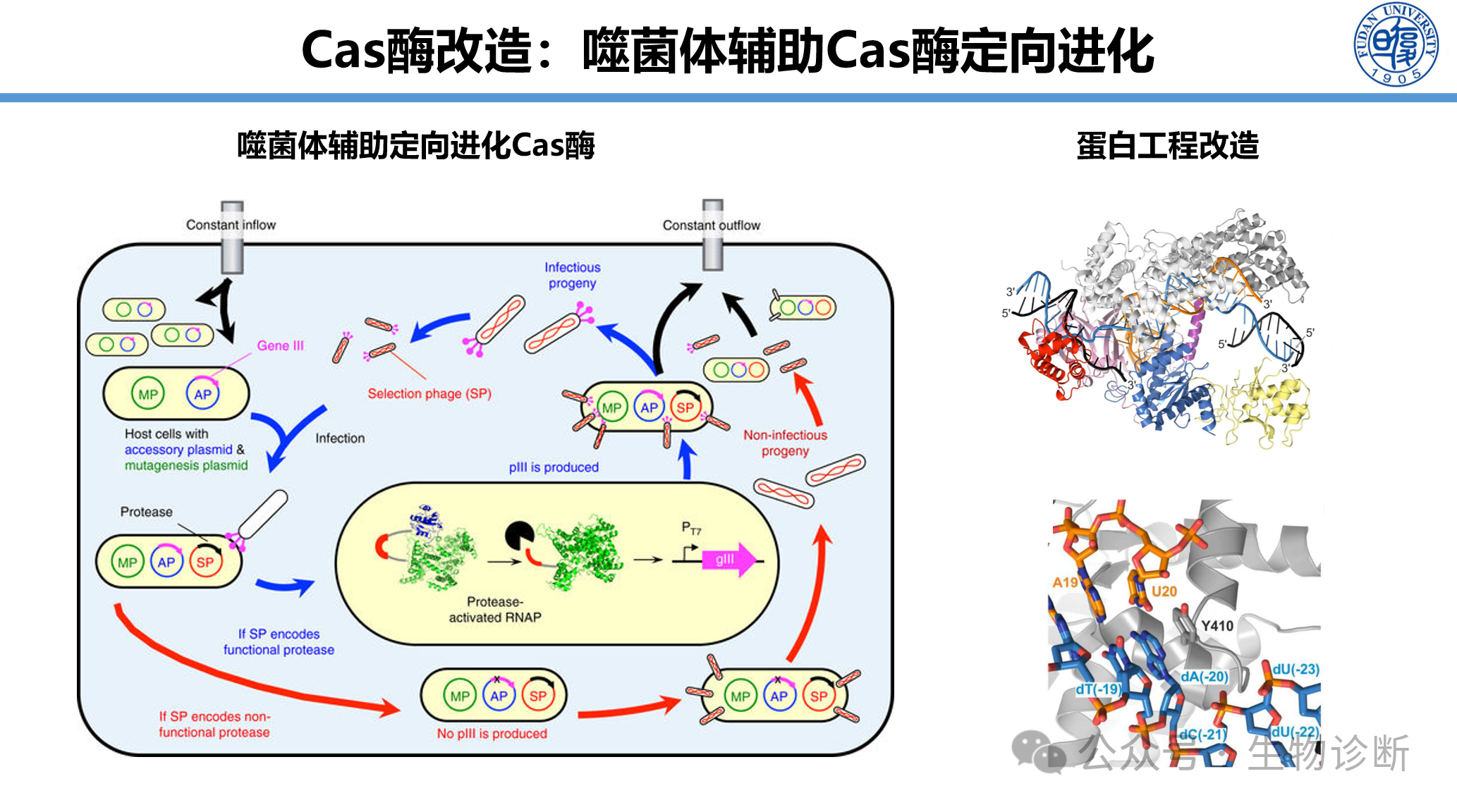 噬菌体辅助定向进化:将目标蛋白与抑制系统融合表达于噬菌体,在进化过程中产生突变文库。活性提升的突变体可解除抑制,恢复噬菌体外壳蛋白表达并释放子代噬菌体,通过多轮筛选获得性能优化的Cas酶。