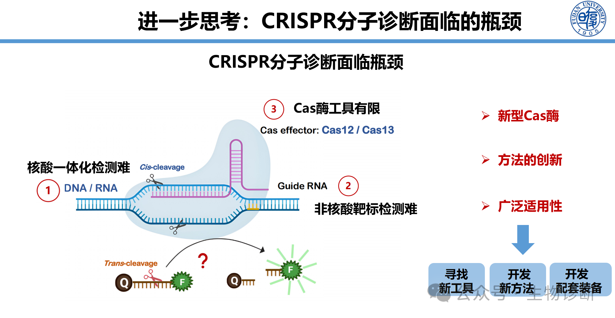 CRISPR-Cas系统因其高分辨率、高特异性、可编程性以及简便快捷等特点,被誉为下一代分子诊断技术。然而,其在实际应用中仍面临三大瓶颈: