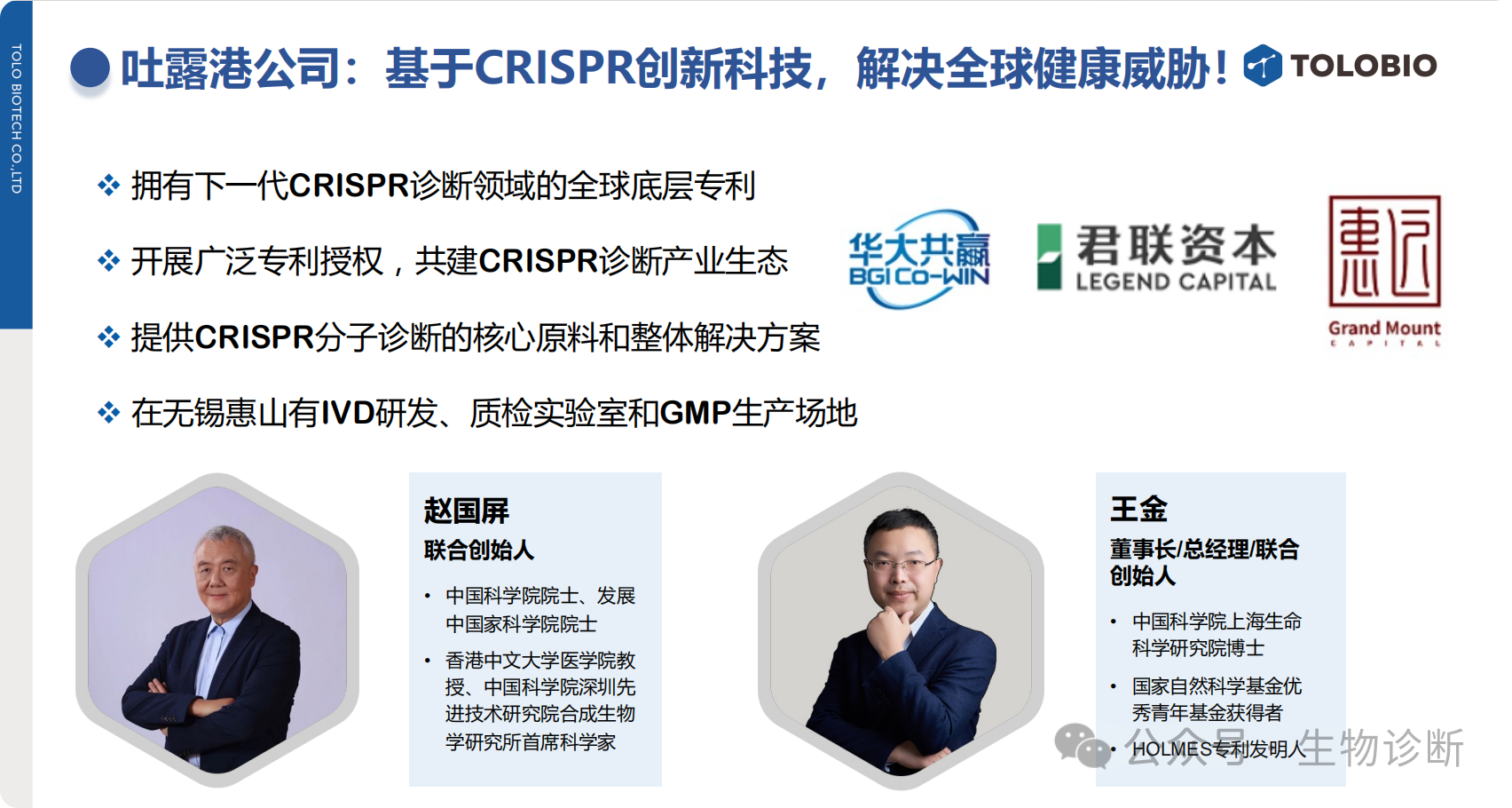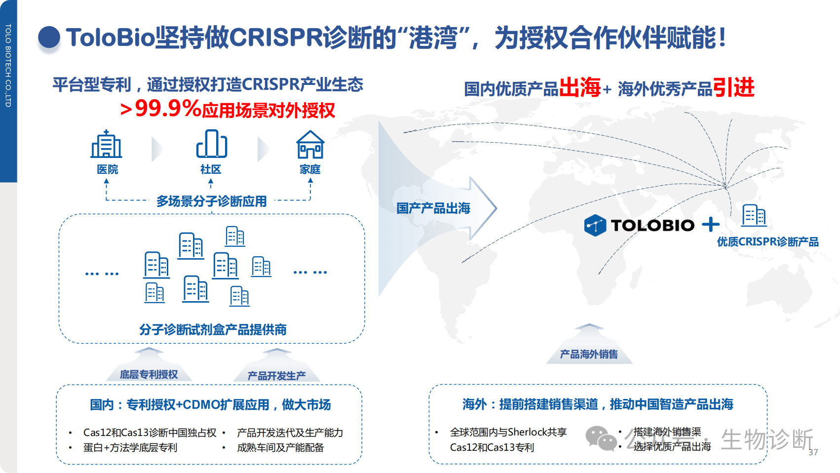 公司以"基于CRISPR创新科技解决全球健康威胁"为使命,致力于推动检测技术向更简便的方向发展。ToloBio拥有CRISPR诊断领域的底层专利和方法学专利,并积极构建CRISPR诊断产业生态。作为开放型创新平台,公司秉持合作共赢理念,为行业伙伴提供核心原料和整体解决方案。