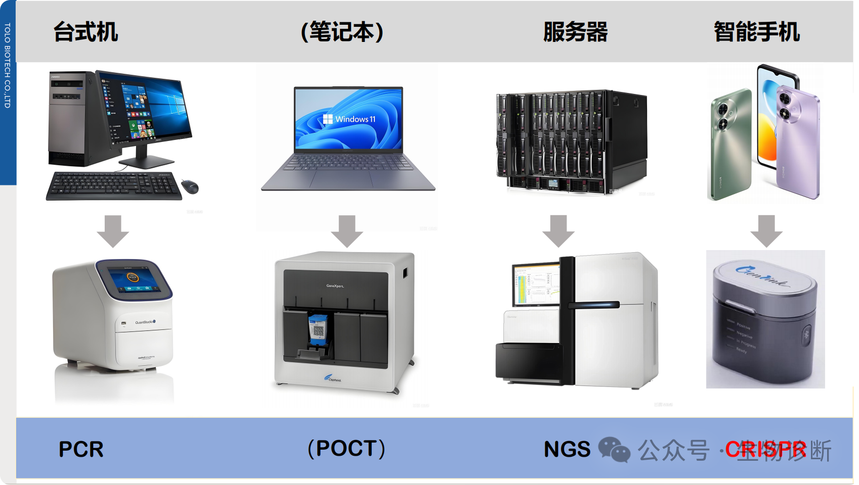 参考现代化办公设备演变(台式机→笔记本→服务器→智能手机),分子诊断技术呈现“便捷化、移动化”趋势: