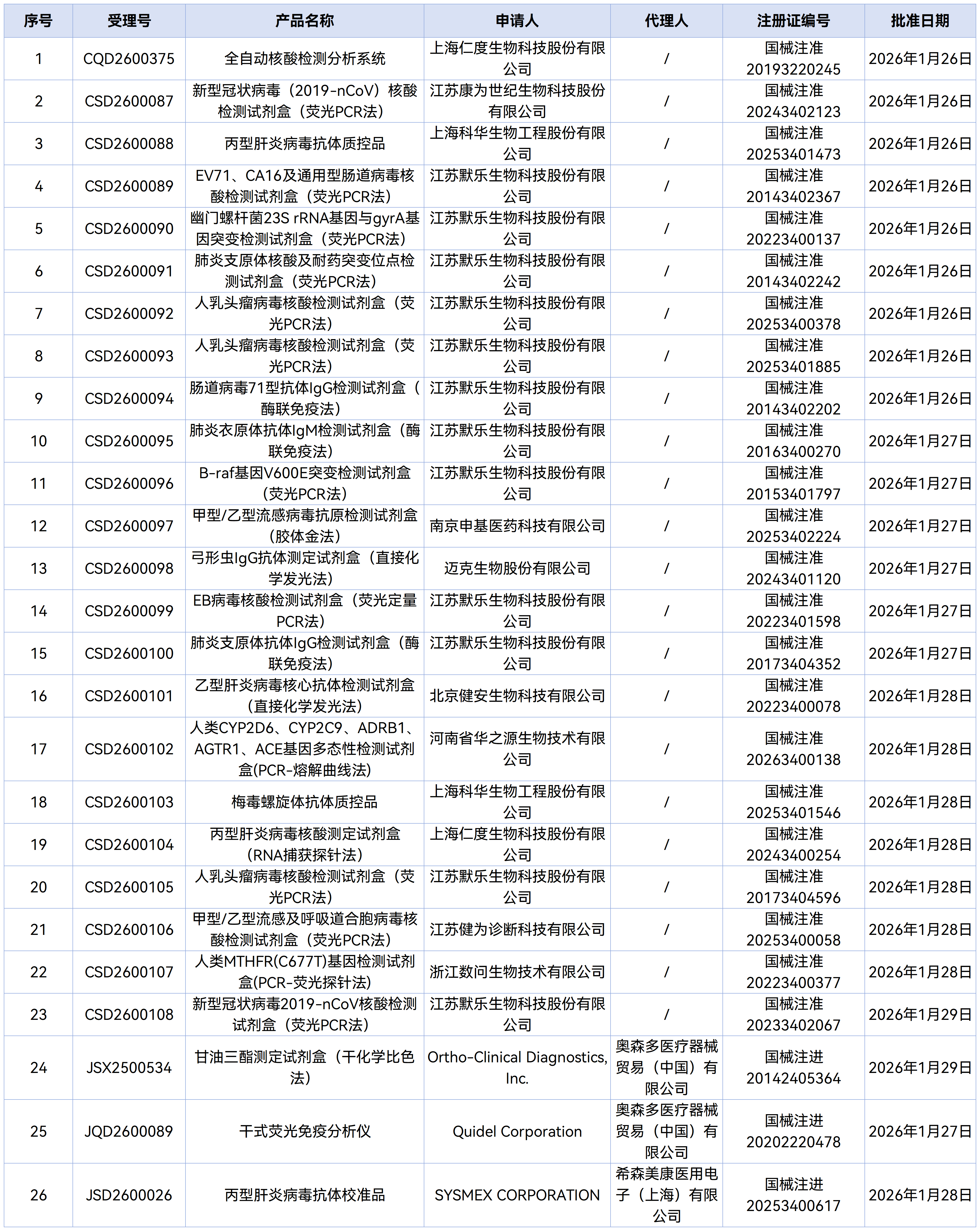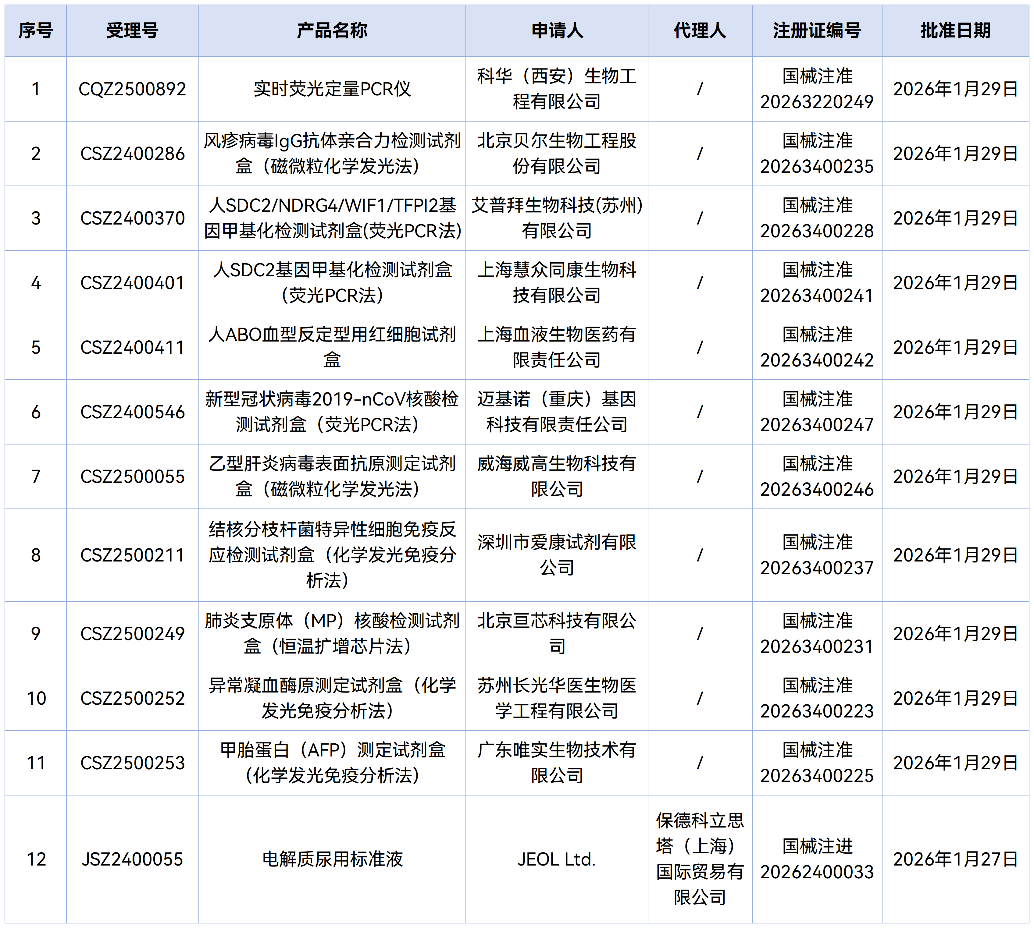 1月30日,国家药监局审批通过了143款医疗器械,其中有12款IVD新品获批上市,26款IVD产品变更注册。